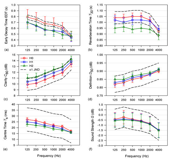 Simulated monaural acoustic parameters in the Roman theatre of Malaca in the three hypotheses, theatre with the hill and the Alcazaba, Hypothesis 0 (H0); without the Alcazaba, Hypothesis 1 (H1); and without the hill and the Alcazaba, Hypothesis 2 (H2): (a) Early decay time, EDT; (b) Reverberation time, T30; (c) Music clarity, C80; (d) Definition, D50; (e) Centre time, TS; and (f) Sound strength, G. For each parameter, dashed lines correspond to ± 1 JND of the H0 values, and the vertical bars correspond to the standard errors.