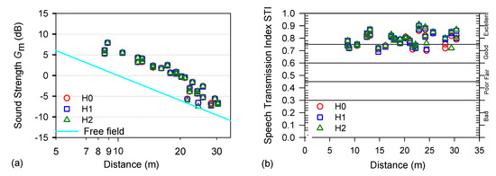 Figure 6b displays the speech index STI as a function of the source-receiver distance. Results show that, even a great distance from the source, the values are in the excellent interval and that only in two receivers at 28 m is there a small difference between the three hypotheses of simulation.