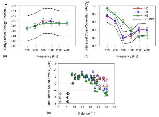 (a) Early lateral energy fraction JLF, (b) Early inter-aural cross-correlation coefficient IACCE, as functions of frequency; and (c) Late lateral sound level LJ as a function of source-receiver distance in the three hypotheses: theatre with the hill and the Alcazaba, Hypothesis 0 (H0); without the Alcazaba, Hypothesis 1 (H1); and without the hill and the Alcazaba, Hypothesis 2 (H2). In the upper plotted graphs dashed lines correspond to ±1 JND of the H0 values, and the vertical bars correspond to the standard errors.