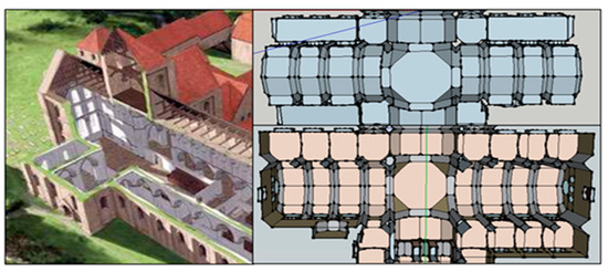 Even upon concluding this procedure, the modelling process still contained a large degree of uncertainty. A key example of this is with the Abbeys tower. In Hope and Brakspear 1906 paper the only reference is that there was likely a tower at the crossing of the transept tower [8]. Many towers of this period are closed such as Roche Abbey [30]. Based on this research the closed tower approach was taken for Beaulieu Abbey. The below Figure 3 is an illustration of Roche Abbey with a closed tower alongside a modelled Beaulieu Abbey tower.