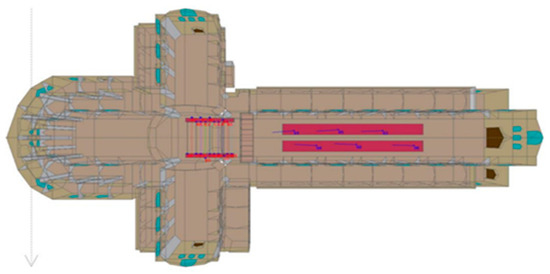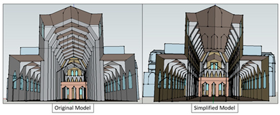 The results from the Bradley and Wang study concluded that if the geometry of the main structure is constructed accurately then the level of detail has minimal effect on results [32]. The methodology used by the current study was to only model components smaller than 0.5 m, equivalent to 700 Hz wavelength [9]. However, this was only adhered to when it did not jeopardize the inclusion of the structure’s crucial features [32]. Upon exporting the model into CATT, a calculation was conducted in line with Bradly and Wang research and the model’s detail was found to be above recommendations [32]. The model was therefore simplified until the ratio between planes and volume equaled 0.03 (based on a predicted abbey volume of 44,673 m3), with the intention of using scattering coefficients to counterbalance the simplified structure [25].The main simplification was of the arches as displayed below in Figure 4.