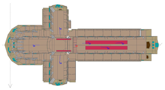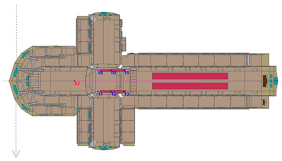 While the same sound source properties used to simulate the speech voice from the pulpit (reported in Section 2.4) were also employed to emulate the priest’s speech from the altar, six receivers were taken into consideration across the quire area at 1.2 m to reproduce seated audience conditions. Figure 6 shows sound source and receiver positions.