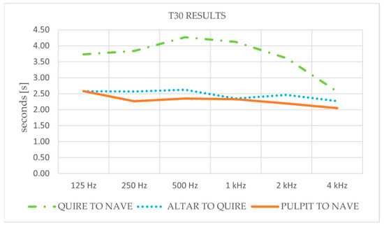 Several studies have found similar values in T-30 results. In particular, the analysis of the T-30 values from previous studies shows the typical behavior observed in the majority of Gothic churches [10,11]. Desarnaulds and Carvalho research of five Gothic churches with different volumes [12], observed that in terms of volume, dimensions ≥ 10,000 m3 lead to a significant decrease of the reverberation time for frequency bands > 2 kHz. Greater values of reverberation time have been observed in churches such as St. Petronio Basilica in Bologna due to the enormous volume (170,000 m3). Álvarez-Morales et al. [10] and Desarnaulds and Carvalho [12] agree that air absorption explains this effect in this frequency range.