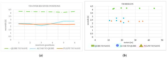 Additionally, Figure 9 reports mid-frequency [500 Hz–1 kHz] averaged T30 results over distance. It can be noticed, by taking into account the standard deviation (SD) values for each simulated scenario, low and similar in T30 results are found both when emulating a speech scenario from the pulpit to the nave area (SD = 0.03) as well as sacral chants sung from the quire to the nave section (SD = 0.04). Conversely, the greatest variation in T30 values is observed when simulating a speech from the altar to the quire section (SD = 0.23). Finally, considering the Just Noticeable Difference (JND) values based on the lowest T30 results from each emulated set, it is observed how variations above standard JND% are only found for the simulated speech scenarios.