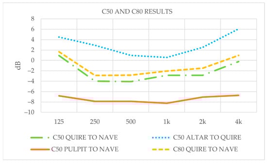 As it can be observed from Figure 10 despite decreases at mid-frequency bands are observed for the spoken simulated scenarios, increases at highest frequency bands in C50 and C80 values are generally found for all the presented scenarios. Specifically, while the lowest C50 values are observed for the modelling settings emulating a speech given from the pulpit towards the nave, highest values are noticed for the same hypothetic sound source, simulating a speech male voice addressed to choir monks disposed within the quire area. On the other hand, considering C50 and C80 values over frequency bands, it is noticed how differences exceeding 1 JND value are found for almost all the analyzed frequency bands (250 Hz–500 Hz–2 kHz–4 kHz–8 kHz).