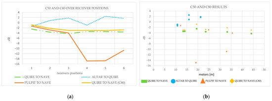 C50 results: (a) C50 results over receiver positions; (b) C50 results over distance.