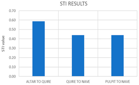 STI measured values from Christian worship buildings showed spatial averages of 0.49 and 0.40, implying similarities between Cistercian and Gothic architecture [12,15]. Finally, it should also be noticed how “FAIR” STI values for non-native speakers can only be reached with values ≥ 0.75 [18]. Therefore, as can also be observed from Table 9, the simulated STI values, as well as the rest of the cathedrals examples, could only provide bad or poor speech intelligibility properties. The observation is in accordance with the fact that before Vatican II in 1963 there was no desire for low RTs and high intelligibility since liturgy was sung in Latin only [53].