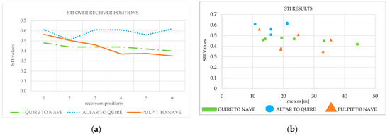 STI results: (a) STI results over receiver positions; (b) STI results over distance.