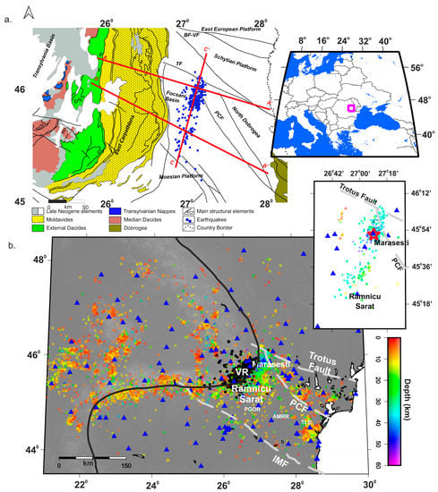 (a) Main geological units within the epicentral area (modified after []) and epicenters distribution (blue dots) of the seismic events associated with the 2014 Mărăşeşti sequence. The inset map shows the study area (pink square) displayed at the regional scale. The red line represents three vertical cross-sections crossing the epicentral area. (b) Seismic activity at the SE Carpathians Arc bend according to the ROMPLUS catalogue (between 2010 and 2014, []) colored function of depth (intermediate-depth events in black and crustal earthquakes within the color scale—right side), seismic stations distribution (blue triangles) and neighboring cities. The white dashed lines represent the local fault system; the black line shows the Pericarpathian Fault. The inset map shows a zoom of the epicentral area. The red star shows the mainshock epicenter. The abbreviations are as follows: VR—Vrancea Zone, IMF—Intra-Moesian Fault, PCF—Peceneaga-Camena Fault, AMRR—Amara, PGOR—Pogoanele, TLB—Topalu seismic stations.