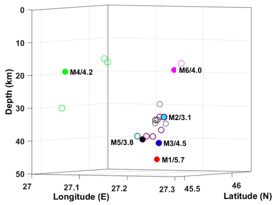 To determine the source parameters of the earthquakes that occurred during the 2014 seismic sequence close to the Mărăşeşti, and also for the events triggered by this seismic activity, we searched in the ROMPLUS catalogue (November 2014–July 2015) for clusters of events (co-located events with similar waveforms). Each cluster has one or several main events and associated EGFs. The selection of clusters is carried out in two steps. To select the potential EGF events, we started with the mainshock (M1/5.7 in Figure 3) and searched among the events within a magnitude able to solve the source parameters within the frequency range of the available data. First, for each main event (M) we searched in the aforementioned catalogue for potential EGF events if the inter-hypocenter distance is less than 0.3 deg. and the difference in magnitude around one magnitude unit or more. As a second step, we applied the waveform cross-correlation technique to select as EGF events those with large cross-correlation coefficients (CC ≥ 0.7). A high cross-correlation for a pair of events is considered to consistently reflect the waveform similarity among them [,]. For the waveform correlation analysis, we used time windows based on the magnitude of the M [], a length of 0.5–1 s being enough for the small size events. The waveforms are bandpass filtered to an appropriate frequency band, using a two-pole Butterworth filter. We low-pass filter both the M and each potential EGF at a frequency related to the expected corner frequency of the M. This is because large and small earthquakes are not expected to cross-correlate well at high frequencies (e.g., []). We applied cross-correlation separately for P and S waves.