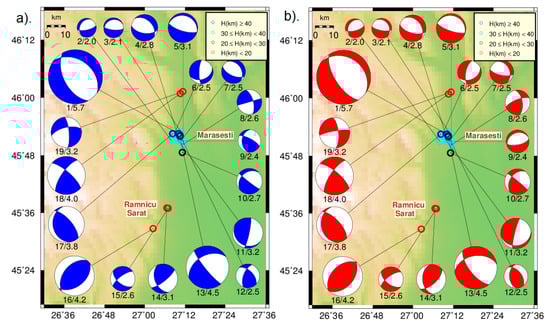 The fault plane solution has a significant relevance since it is directly used to determine the stress regime of a region. To obtain a high accuracy in determining the focal mechanisms, we selected only the events whose recordings (broadband or short-period stations) allowed us to read with enough accuracy the P-waves’ first motion at a minimum of 12 stations. Two methods provided by the SEISAN algorithm [] are applied. Both FOCMEC [] and HASH [,] algorithms use the first P-wave polarities together with the amplitudes measured on all three components (vertical, transversal and radial). The FOCMEC method is more rigorous since it removes the erroneous polarities and ratios above an imposed limit (we adopted 0.3 in our case). HASH uses weights for the polarity and amplitude ratio errors and provides averaged values, without eliminating the stations with large errors. For both methods, we filtered the seismograms, removing the frequencies above the corner frequency, and measured the maximum amplitudes at intervals of maximum 2s starting at first P, then respectively S arrivals.