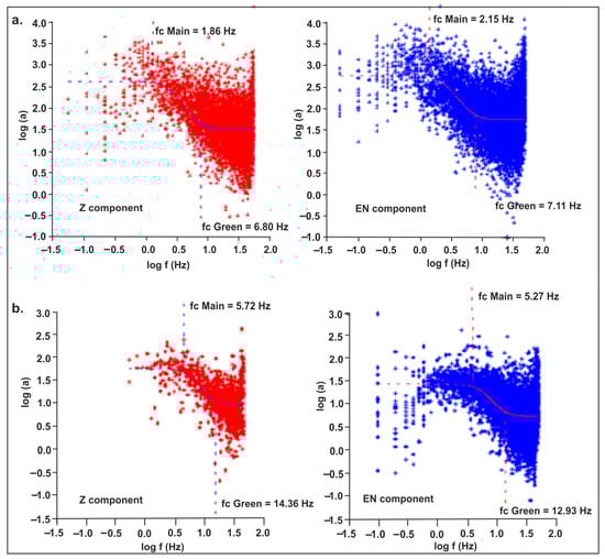 Spectral ratios determined (for vertical-left and horizontal-right components) for the following pairs: (a) M of 22 November 2014, 19:14 and EGF of 22 November 2014, 20:30; (b) M of 19 January 2015, 23:53 and EGF of 20 December, 02:52.