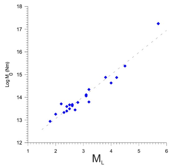The scaling shows a similar trend with those obtained for other areas. Thus, the slope value of 0.97 is similar to the values of ~1.1, previously obtained by other studies [,,]. The deviation highlighted by the mainshock (ML = 5.7) can be explained by a possible underestimation of ML for large earthquakes since the value of M0 determined in this study is similar to those computed by the international seismological centers (GFZ, EMSC, CSM, NEIC). A second possible explanation for this deviation is given by an overestimation of seismic moments of small earthquakes (ML < 4). Several studies achieved in different regions [,] pointed out, for these magnitudes, seismic moments with values smaller by up to an order of magnitude.