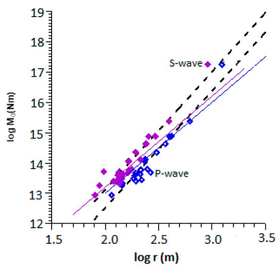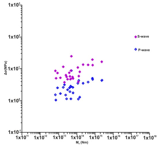 The scaling of stress drop with the seismic moment (Figure 10) indicates an increasing value stress drop over the entire magnitude range. The stress drop values are in the range 1–41 MPa for P waves and 4–101 MPa for S waves. However, the increasing trend of the distribution may be apparent as the decisive element is given by the comparatively higher value of the stress drop in the case of the mainshock of 22 November 2014 (for the rest of the events, if we remove the largest event, a constant stress drop scaling seems to be reasonable). The statistics are too small for larger earthquakes to have an eloquent image of scaling. In Figure 10 we can notice both for P and S-wave determinations an increasing trend of stress drop with the seismic moment which may suggest a higher slip rather than a higher fault dimension [].