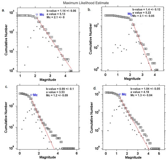 Frequency–magnitude distribution computed for four-time intervals: (a) 2005–2011; (b) 2011–2014; (c) 100 days since 22 November 2014; (d) 2015–2020.