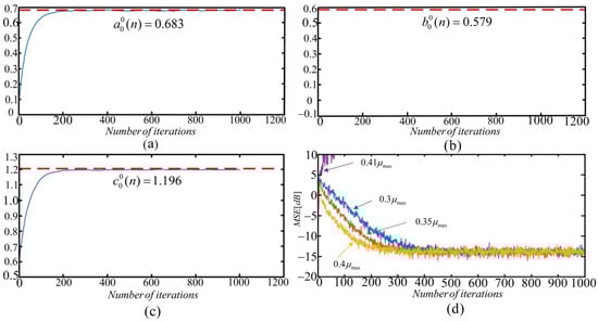 Firstly, by inputting the data into Equations (12)–(14) of the improved EE-based ANC system model, the learning process of the weight coefficients can be calculated as shown in Figure 6a–c. Moreover, we can compute the optimal weights , , and (the first column vector of the optimal weight coefficient matrix). Secondly, according to Equations (17)–(20), the step size bounds can be computed as , , and .