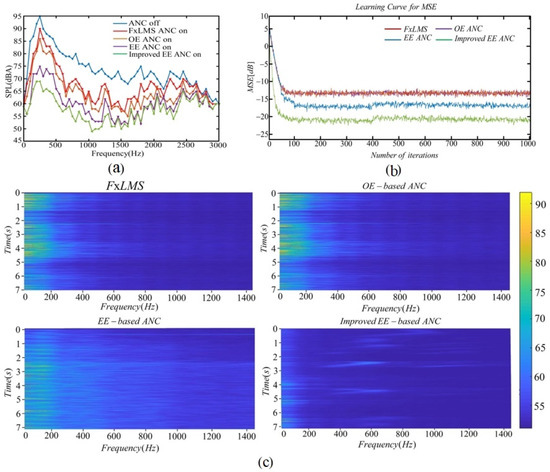 (a) Indicates the noise reduction performance comparison of different ANC systems, the ordinate is the A-weighted sound pressure level, and the abscissa is the frequency. (b) The convergence process of the mean square error of each algorithm. (c) Time–frequency diagram of different algorithms after noise reduction.