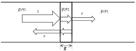 Schematic diagram showing the movement of an ultrasonic wave through a barrier plate with thickness g and impedance ρ2 v2 within a medium with impedances ρ1 v1.
