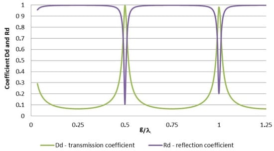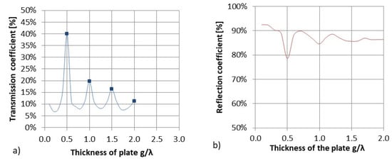 Figure 3 shows that the transmission and reflection coefficients of the wave have extreme values at points where the wavelength is a multiple of half of the plate thickness. This observation has also been described by numerous scientists [,,].