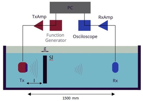 Schematic diagram of the stand for researching the transmission of an ultrasonic wave through a steel plate barrier; Tx—ultrasonic transducer; Rx—receiver (hydrophone); Sl—steel plate with thickness g; l—distance between the plate and the transducer.