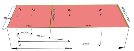 Model of a water aquarium with a transducer Tx and receiver Rx placed between two steel plates.