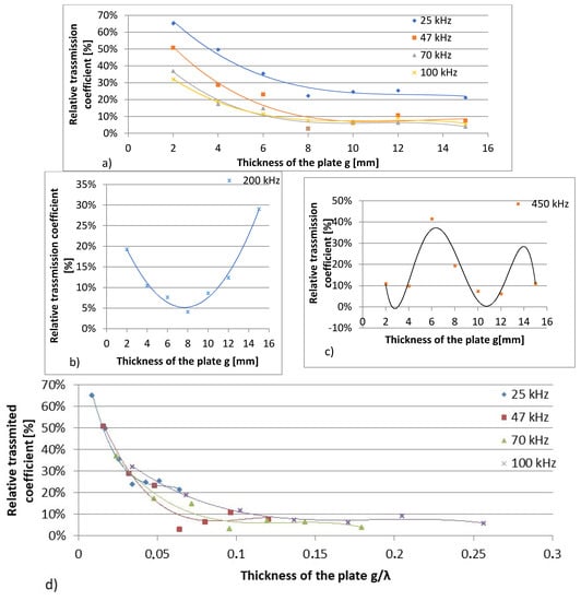 The behavior of the above-mentioned curves can be explained when these figures are presented in a system in which the plate thickness is expressed in units of the wavelength of the ultrasonic wave. Since the thicknesses of all the plates used in the experiments are lower than a quarter of the wave length of an ultrasonic wave of 25 kHz to 100 kHz in steel (Table 2), the transmission coefficients of all the above-mentioned waves decreases (Figure 8d).