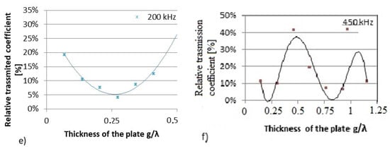 For the ultrasonic wave with 200 kHz frequency, one quarter of its wavelength for steel is 7.31 mm (Table 2), so for a plate 8 mm thick the transmission coefficient is at a minimum (Figure 8e). For the wave with 450 kHz frequency, half of the wave length is 6.5 mm (Table 2), for a steel plate with thicknesses of 0.5 λ and 1 λ the transmission reaches a maximum and for thicknesses of 0.25 λ and 0.75 λ the transmission coefficient is at a minimum (Figure 8f). Therefore, all the results obtained from the experiments are in agreement with the theoretical background.