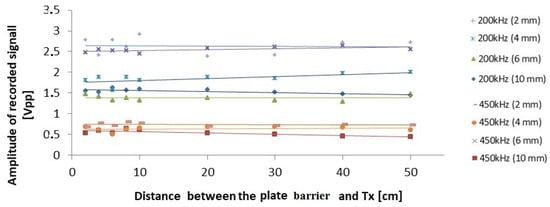The influence of the distance between transducer (Tx) and plate barrier was also investigated. This investigation relied on the measurement of the amplitude of the ultrasonic wave transmitted through the plate barrier placed at different distances from the transducer. The distance between the receiver (Rx) and the transducer (Tx) was 1500 mm and was not changed for the whole series of experimental readings. The experiments were done using ultrasonic waves with frequencies of 200 and 450 kHz for plate barriers with thicknesses of 2 mm, 4 mm, 8 mm, and 10 mm and for a distance between the transducer Tx and the plate barrier that was varied in the range from 2 cm to 50 cm.