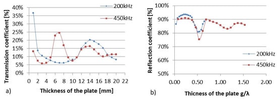 Figure 10a,b show the dependences of the transmission and reflection coefficients of ultrasonic waves with frequencies 200 kHz and 450 kHz on the thickness of the plate barrier expressed in unit of millimeters and in the ratio of g/λ, respectively. The extreme values of these coefficients are at the points, where the thickness of the steel plates is either half or one ultrasonic wave length.
