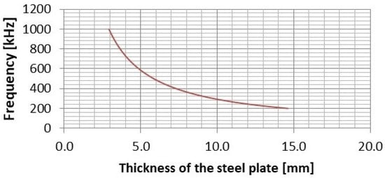 Both the experimental and the simulation results establish the dependence of the appropriate ultrasonic wave frequency, i.e., the one producing the maximum values for transmission on the thickness of the plate barrier, and this dependence is presented in Figure 12.