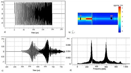 The signals transmitted had linear frequency modulation in the ranges of 100–800 kHz and 550–650 kHz with 5 Pa of pressure amplitude. The frequency spectra of the signals received were also analyzed. The duration of every simulation was 1.5 ms.