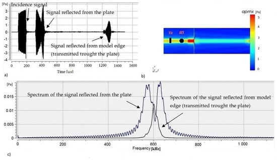Referring to the above problem, simulation tests were carried out where both the emitter and receiver of the ultrasonic signals are placed on one side of the barrier. Simulations were performed for plates with thicknesses of 5 mm (Figure 14) and 10 mm (Figure 15). Receiver R1 (Figure 14b and Figure 15b) was used to record (a) the modulated incident signals with frequency 550–650 kHz; (b) signals reflected from a barrier; (c) signals transmitted through the barrier and (d) signals reflected from the model boundary. The signals mentioned in cases of plates with thicknesses of 5 mm and 10 mm are presented in Figure 14a and Figure 15a respectively. The reflected and transmitted signals recorded were subjected to Fourier transform analysis (FFT) and are presented in Figure 14c and Figure 15c.