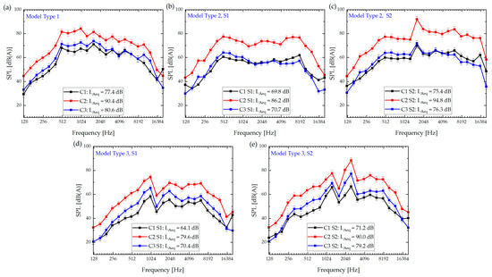 Sound pressure level spectra of three different vacuum cleaners: (a) Model type 1, (b) Model type 2 at minimum speed setting S1, (c) Model type 2 at maximum speed setting S2, (d) Model type 3 at minimum speed setting S1, (e) Model type 3 at maximum speed setting S2. All data are plotted on a log2 scale.