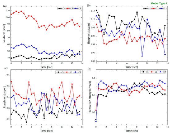 Figure 3, Figure 4 and Figure 5 shows the results of psychoacoustic metrics (loudness, sharpness, fluctuation strength, and roughness) obtained from the recorded sound levels of vacuum cleaner units. Figure 3a shows that the maximum perceived sound intensity is at the user’s right ear and is about 109 sone, as it was located near to the vacuum cleaner (model type 1). Moreover, the user’s left ear C3 experienced slightly higher loudness than the surrounding occupants C1. Furthermoer, C1 has larger sharpness values than C2 and C3, implying that the sharpness was the highest for the surrounding occupants (Figure 3b). In Figure 3c, the user’s right ear (C2) encounters the highest roughness value in the 30–300 Hz modulation frequency. Furthermore, the fluctuation strengths captured are nearly identical in all microphones.