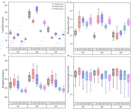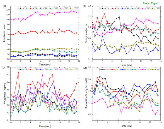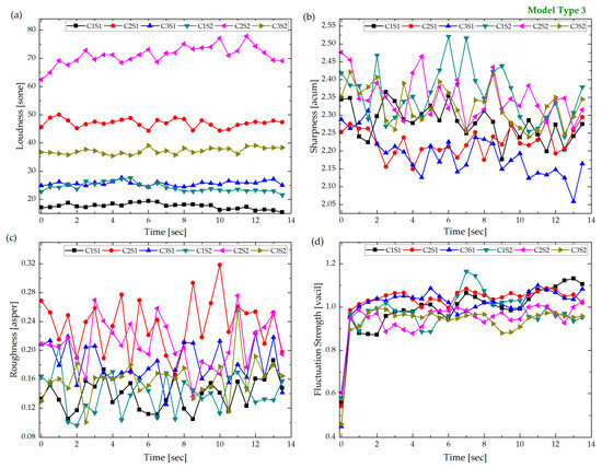 Figure 6 presents the comparative results of psychoacoustics parameters for three vacuum cleaners. As shown from Figure 6a, model type 1 produced the highest loudness for the surrounding occupants C1 (41.5 sone), followed by model type 2 (36.7 sone) and model type 3 (17.6 sone) at the maximum and the minimum settings. In addition, the loudness captured at the right-side ear mic C2 was higher than the left ear mic C3. Since the vacuum cleaner was operating on the user’s right hand (Figure 1a), the person’s body might obstruct the path of the sound wave in reaching the left ear. The most substantial loudness impact towards the user’s right ear resulted from model type 2 at the maximum setting (C2S2) with a value of 110 sone.