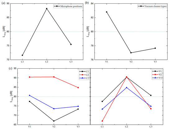 Main effect plots for (a) microphone positions versus and (b) vacuum cleaner types versus . (c) Interaction plots for equivalent continuous sound levels.