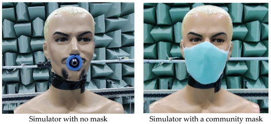 Close-up of the simulator head with no mask (left) and wearing a community mask (right).