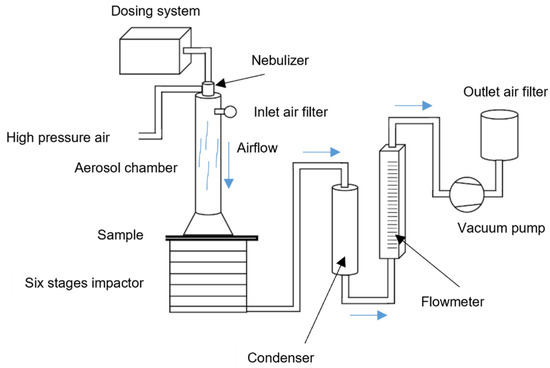To measure BFE, an aerosol stream containing a known charge of Staphylococcus aureus ATCC 6538 is forced to flow through the mask material and a six-stage Andersen cascade impactor [18]. The impactor is an aerodynamic particle sizer and separates the incoming aerosol droplets in six different size classes by impaction of the droplets. Each stage contains a petri dish with an agar medium on which droplets of a given size class impact; after the incubation of the petri dishes, a bacterial colony will form at the point of impact of each droplet. Counting the bacterial colonies allows one to measure the number of droplets which have impacted at each stage and the size distribution of the impacting droplets can therefore be inferred from the distribution of the colony counts in the six stages. By performing the test and counting the colonies forming units (CFU) with the mask sample CFUtest and without CFUcontrol (positive control), one can compute the BFE according to Equation (1). The bacterial filtration efficiency is therefore measured indirectly. The standard specifies the test conditions, the most relevant of which are a constant air flow rate of 28.3 L/min in a cylindrical test chamber having 80 mm diameter and 600 mm length, carrying an aerosol whose mean particle size (MPS) is in the range from 2.7 µm to 3.3 µm and providing an average number of CFUs in the positive control between 1700 and 3000.