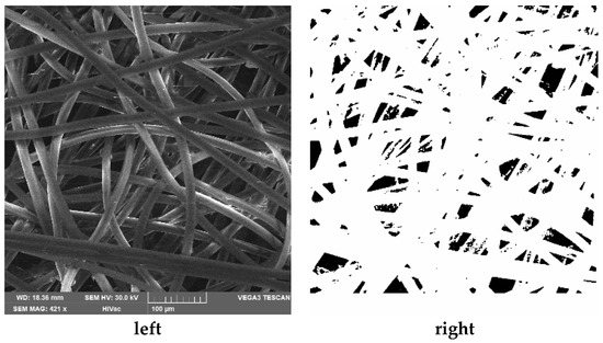 Once SEM parameters have been set in order to optimize image contrast, acquired images have been binarized through thresholding, in order to separate fibers from the dark background (Figure 5). The latter procedure has been repeated five times for each sample under the continuous monitoring of the operator. The average percentage of void area over the five measurements have been considered and this non-dimensional parameter, a percentage, is an estimator of the mask porosity. Repeated measurements allow for the estimation of an average estimate, accounting for inhomogeneities of the material. This approach, based on two-dimensional imaging can be applied to for an indirect measurement of porosity, given the fact that each mask layer is inherently a two-dimensional structure, with negligible thickness, in the order of some tenths of a millimeter.