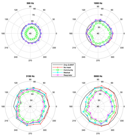Looking at the plots, it is also evident that community masks produce the greatest effect in modifying directivity and increasing attenuation, as evidenced also in [15]. This phenomenon is indeed clear both in the low (500 Hz) and high frequency ranges. As respirators are concerned, they start modifying directivity and attenuating noise in the high frequency range. Contrarily, medical masks seem to have a reduced impact on the source directivity as well as on the attenuation.