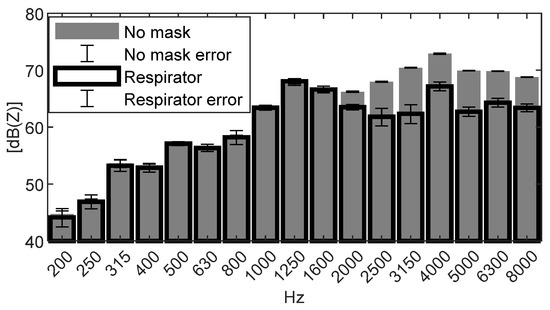 Figure 7 reports the 1/3 octave acoustic pressure spectra, from the 200 Hz to the 8 kHz band, acquired by the microphone positioned in front of the mannequin mouth. The grey bars correspond to the test with no mask and the black bars to the test with one of the mask typologies, i.e., the respirator one. An error bar is superimposed to show the spread of data associated with averaging process over the five repetitions performed for each mask tested; this is an estimate of the reproducibility of the test, as said in Section 2. We plot an interval equal to ±2 standard deviations, i.e., coverage factor of 2 has been used to represent the interval which provides a 95% confidence level. The error bars highlight that the reproducibility is lower for the test with the masks because it depends on the process of placing the mask on the simulator head. This also demonstrates that the way of wearing the mask (more or less close-fitting to the face, for example) will have an impact on the voice radiation. Figure 7 also shows that the acoustic effect of the respirator is the attenuation in the medium–high frequency range, from the 2 kHz band on.