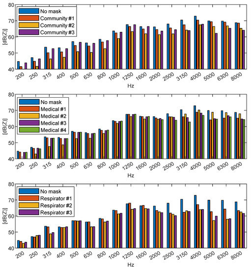 Figure 8 displays the attenuation effect of the different mask samples divided by typology. In each plot, the 1/3 octave band acoustic pressure spectra acquired by the microphone located at the front of the mannequin mouth of each mask for each type tested is represented, as well as for the no-mask condition (blue bars, the first bar of each bar plot). It is evident that different masks exhibit different attenuation even within the same typology. However, we may say that all types of masks attenuate at frequencies above 2 kHz. The community masks exhibit the largest data scatter which is expected because they are not subject to any standard, they differ significantly from each other in terms of material and layering. If we consider the respirators, from the bottom plot we can clearly see that they exhibit the largest attenuation especially at high frequencies. This is probably associated with the materials and their structure. In fact, the respirators are designed to have a tight fit to the face. They also show a limited scatter because they are subject to a strict standardization concerning the material and the layering. Finally, the behavior of medical masks can be considered in between the other two typologies. They exhibit a smaller acoustic attenuation in the high frequency range with respect to the respirators and a larger data scatter. Concerning the low frequency range, it can be stated that in general, only the community masks have an important effect below the 2 kHz band, while medical masks and respirators have not. In the high frequency range, community and medical masks attenuate up to 4–5 dB(Z). The most attenuating typology of masks is the respirator that shows a reduction of up 7 dB(Z) at the 3150 Hz band.