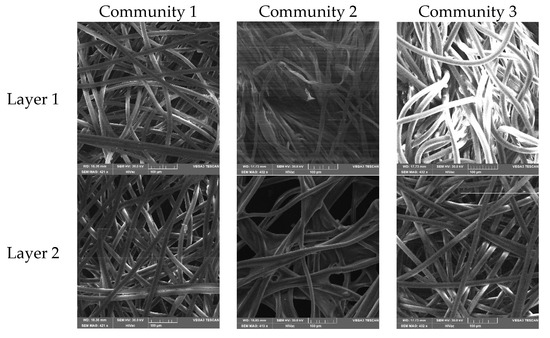 SEM pictures of the layers composing the community masks. Despite the fact that the images seem similar, the third layer of the Community 2 mask presents a denser structure as well as the first layer of the Community 3 mask.