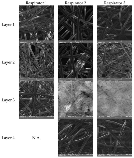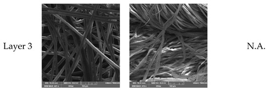 The images acquired by SEM, and reported from Figure 9, Figure 10 and Figure 11, show different characteristics of each layer in the various masks: the fibers dimension, the presence of pores and the geometrical structure of the layers can be very well observed. The different brightness of the images is mainly due to the different quality of the metal deposition on the specimen surface, whose adhesion is slightly different from one type of mask to another, due to the different surface conditions and material characteristics.