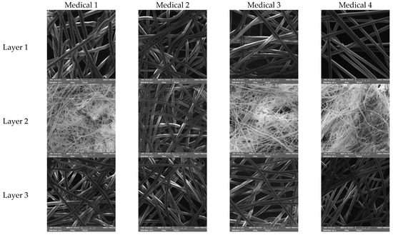 SEM pictures of the layers composing the medical masks. A denser structure with thinner filaments is present in layer 2 of the Medical masks n. 1, 3 and 4.