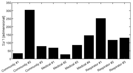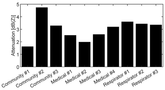 The acoustic attenuation of the masks has been determined considering the sound pressure measured by the microphone positioned in front of the mannequin mouth. The overall sound pressure level integrated in the frequency range between the 200 Hz and 8000 Hz bands, the effective operation frequency range of the Q-HMF source, has been calculated from the acoustic pressure spectra measured in the different configurations: source covered with the 10 different masks and source uncovered. The acoustic attenuation has been estimated by subtracting the overall acoustic pressure level obtained for the 10 masks to the overall sound pressure level attained when the source was not covered with any mask. The synthesis of the attenuation levels is reported in Figure 13. It is clearly evident that community masks behave very differently depending on the material they are made of. Respirators instead are more aggregated in terms of attenuation capabilities, and they exhibit the maximum clustered attenuation levels (about 3 dB(Z)).