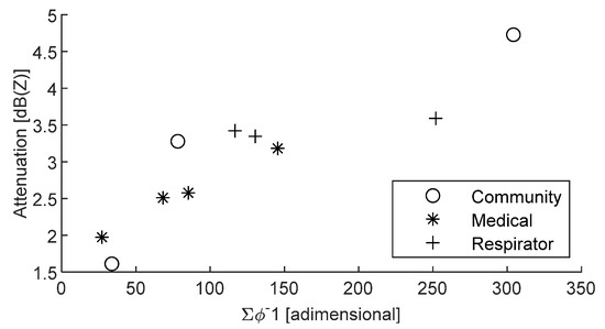 It is now interesting to observe that the trends seen in Figure 12 and Figure 13 are similar. Indeed, a correlation between acoustic attenuation and the void percentage of the mask’s tissues is in accordance with what was stated by Beranek [22] for fibrous media.