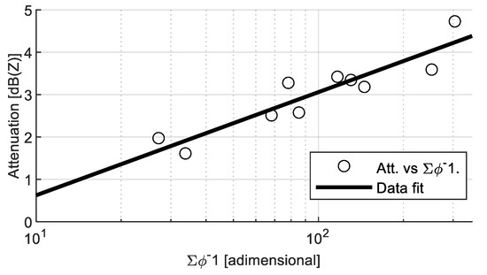 In order to highlight the relationship between acoustic attenuation and the inverse of porosity, we plotted these two quantities in Figure 14. The scatter plot clearly highlights a positive correlation between these parameters, hence contributing to sustain the hypothesis that the porosity in the layers affects acoustic performance. In order to quantify this possible correlation, being the attenuation in a logarithmic quantity, in Figure 15 we also plotted the abscissa in a logarithmic scale; the fact that a logarithmic fit clearly represents the trend of data reported in Figure 15 and that it appears as a linear function, suggests that it is possible to identify a linear correlation between the attenuation levels in dB(Z) and the logarithm of the inverse of porosity. Thus, this confirms that porosity is indeed a major cause of acoustic attenuation. Indeed, if we consider a linear regression model for the acoustic attenuation and the logarithm of the inverse of porosity, we find a strong correlation, with R2 = 0.8. This correlation is also confirmed by the well-known semi-empirical relationship between acoustic attenuation through fibrous materials and their flow resistivity proposed by Delany and Bazley in [23].