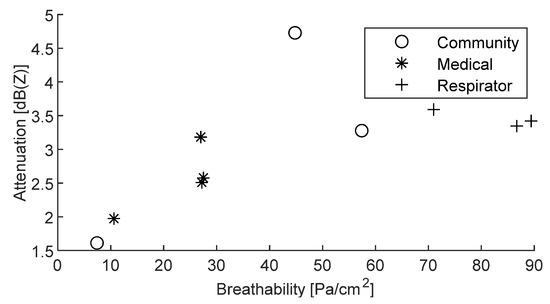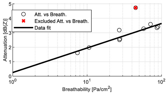 Figure 16 shows these data in linear scale, while Figure 17 shows breathability in a logarithmic scale. An evident correlation between acoustic attenuation and breathability can be seen in Figure 17 if considering the good logarithmic fit on experimental data, showing as a linear trend in log-dB(Z) scale. Acoustic attenuation and the logarithm of breathability data can be accurately fitted by a linear regression model—correlation coefficient (R2) of 0.9—once community mask number 2 is excluded from the dataset.