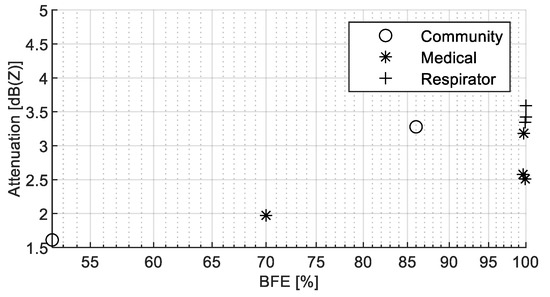 Instead, no correlation is evidenced when comparing acoustic attenuation with BFE, see Figure 18. This can be due to the fact that bacterial filtration efficiency depends on several phenomena, involving different material properties, other than porosity; therefore, porosity of the fibrous medium, which we have seen is well correlated to acoustic attenuation, is influencing BFE, but it is not the main influencing variable.